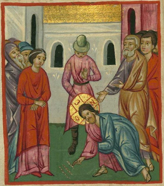 ♦ Des gestes et un regard : « Jésus s’est abaissé pour écrire et a touché le sol, il s’est mis à la hauteur de la femme pécheresse. Dans ce geste, profondément simple, il y a une théologie profonde : Dieu dans la chair du Fils est venu toucher notre terre. Tout est terrestre devant Jésus, mais Il touche la terre pour la ramener dans l’orbite du ciel. (…) Pour enseigner la miséricorde, Jésus écrit sur le sable, comme pour indiquer que les paroles des accusateurs ont pour lui l’inconsistance de la poussière ; il grave son pardon sur le cœur de la femme adultère (…). Et, Lui, le seul sans péché, dit : « Celui d’entre vous qui est sans péché, qu’il soit le premier à lui jeter la pierre », pour signifier que celui qui veut l’application de la Loi doit d’abord l’appliquer à lui-même. Quand la femme fut conduite à Lui, Jésus baissa les yeux pour ne pas la blesser, pas même du regard. Après l’avoir pardonnée, il leva ses yeux vers elle et la femme comprit que le Christ voyait en elle une grandeur et une dignité que le péché ne peut détruire. Il se mit à l’appeler comme il appelait sa mère, Marie : « Femme », aux noces de Cana et sur la Croix, signe suprême de la miséricorde de Dieu. »